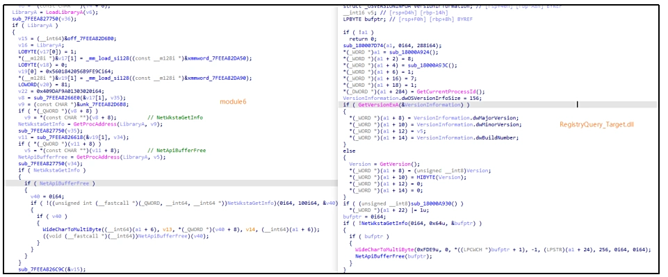 ▲ module6(左)与 RegistryQuery_Target.dll(右)代码同源性对比