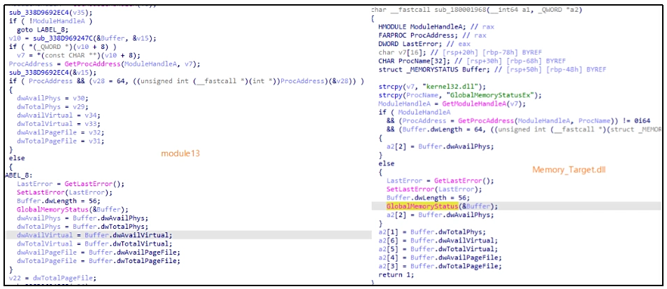 ▲ module13(左)与 Memory_Target.dll(右)代码同源性对比