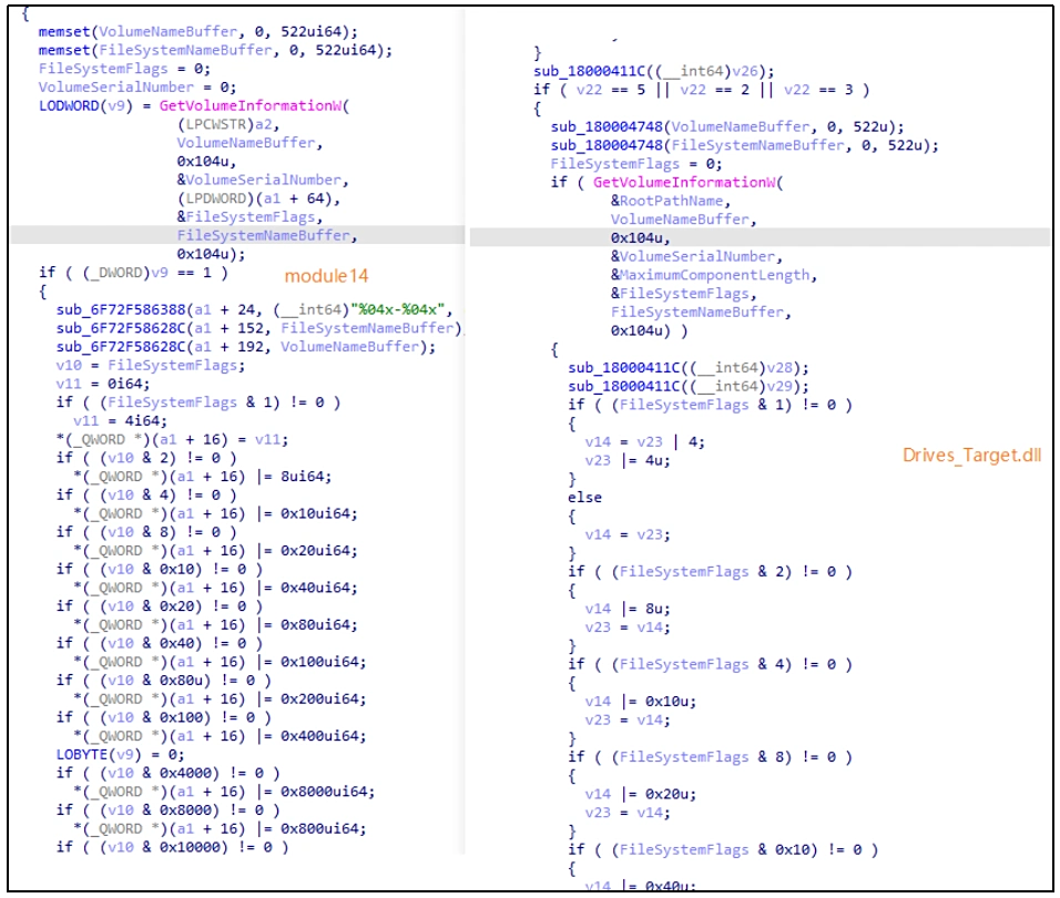 ▲ module14(左)与 Drives_Target.dll(右)代码同源性对比