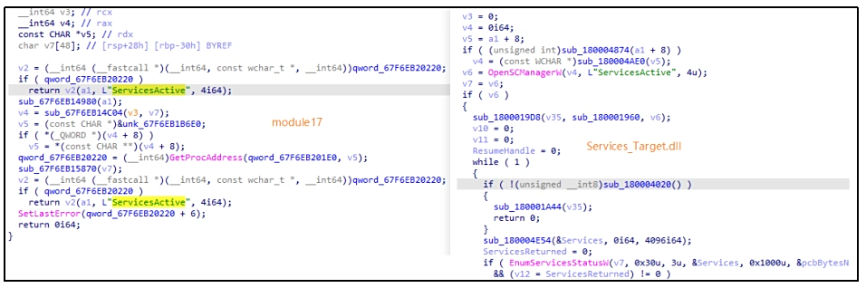 ▲ module17(左)与 Services_Target.dll(右)代码同源性对比