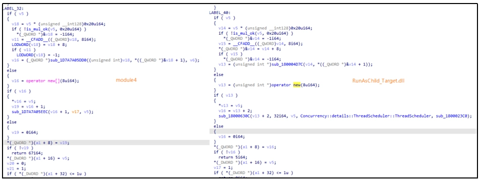 ▲ module4(左)与 RunAsChild_Target.dll(右)代码同源性对比