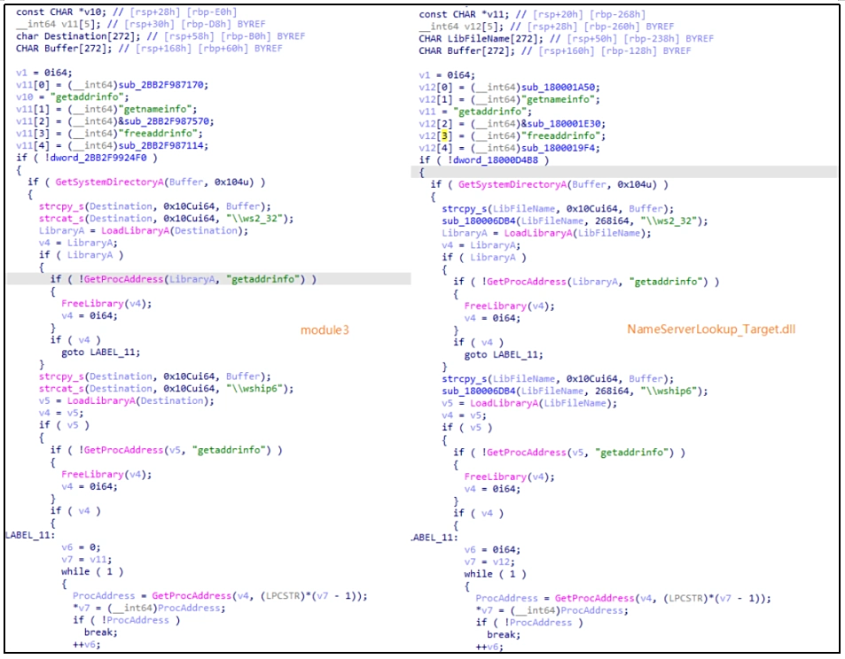 ▲ module3(左)与 NameServerLookup_Target.dll(右)代码同源性对比
