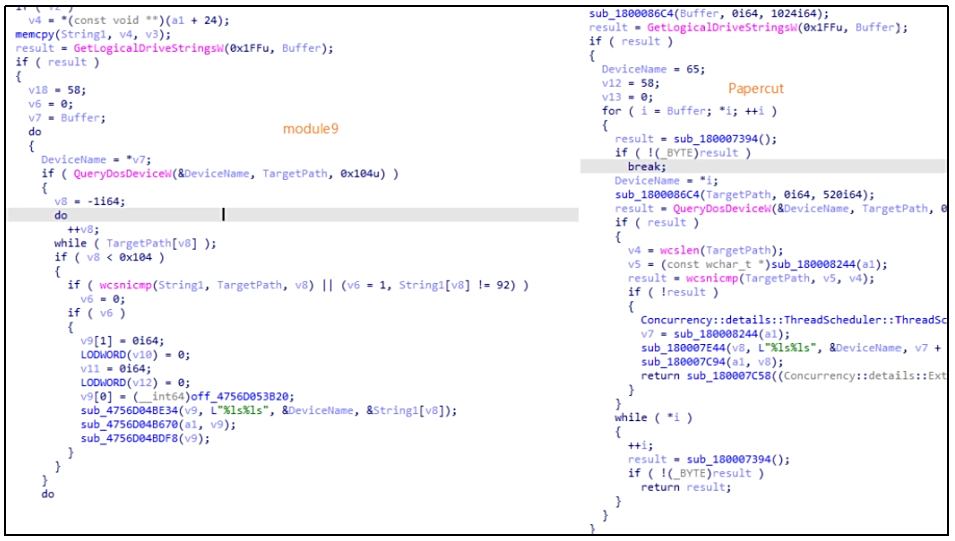 ▲ module9(左)与 Papercut_Target.dll(右)代码同源性对比