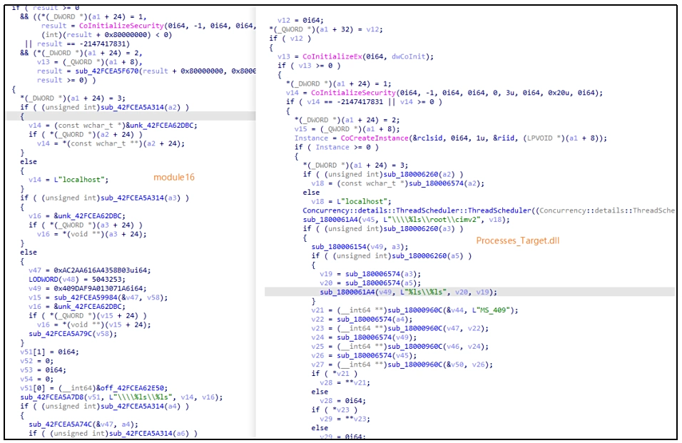 ▲ module16(左)与 Processes_Target.dll(右)代码同源性对比