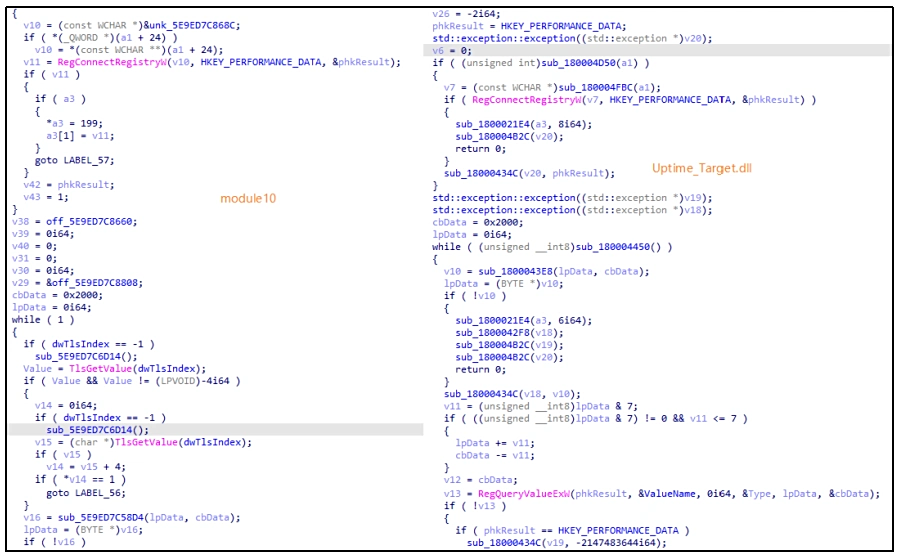 ▲ module10(左)与 UpTime_Target.dll(右)代码同源性对比