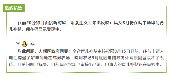 比如,10月16日,在安徽安庆综合广播热线上,有听众江女士来电反映:其女8月份在皖事通申请育儿补贴,现在仍显示受理中。