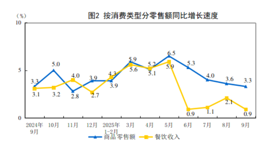 其中,9月份,社会消费品零售总额41971亿元,同比增长3.0%。从消费类型来看,商品零售额37462亿元,同比增长3.3%;餐饮收入4509亿元,增长0.9%。