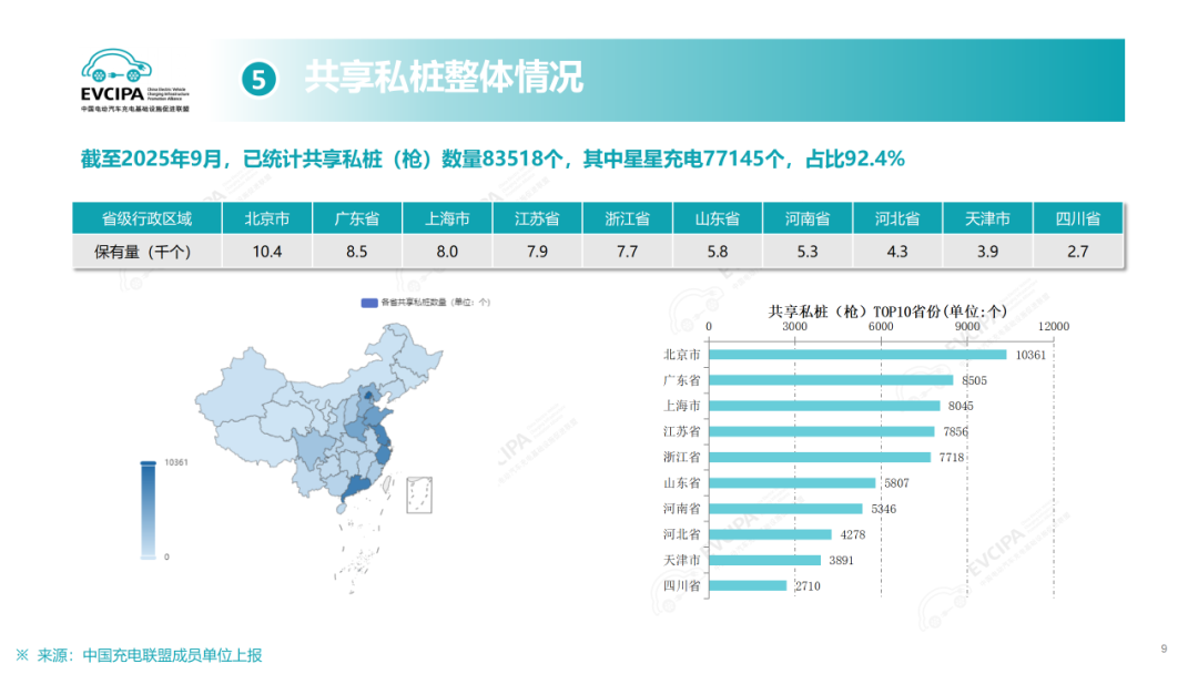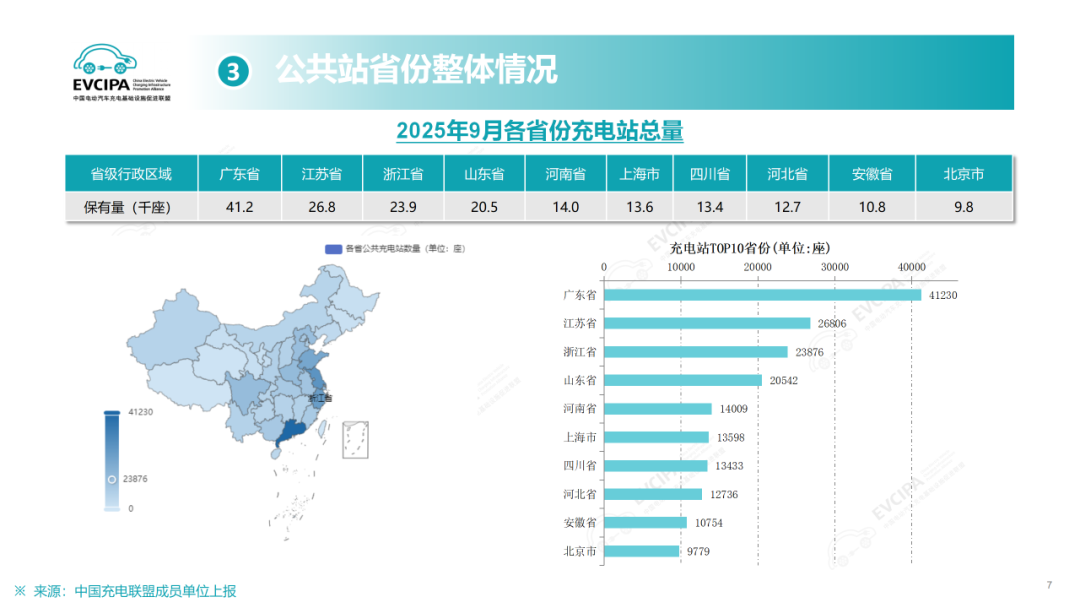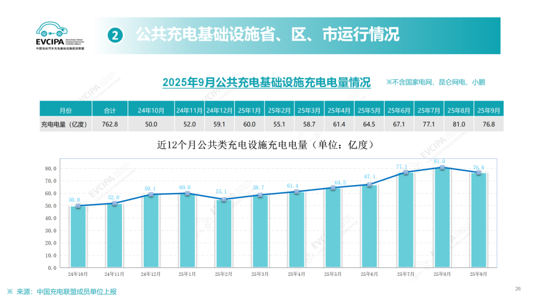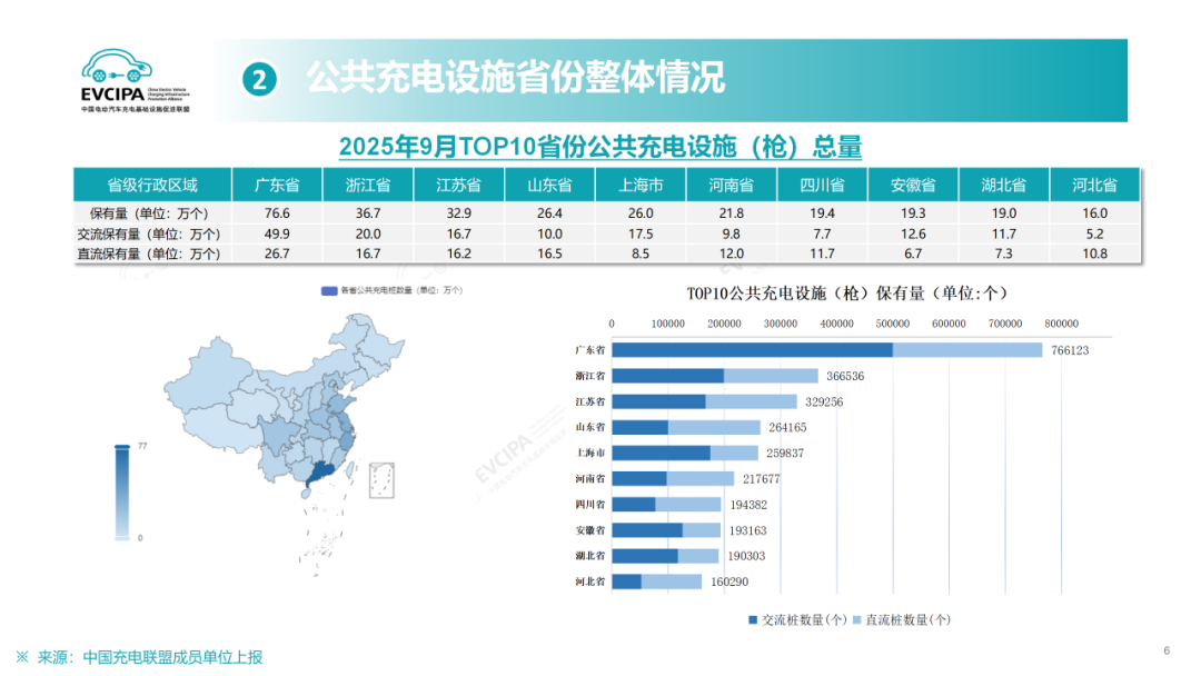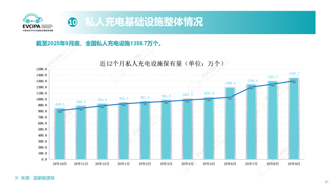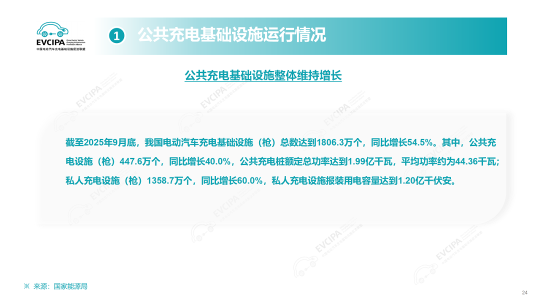 公共充电基础设施运行情况,截至2025年9月底,我国电动汽车充电基础设施(枪)总数达到1806.3万个,同比增长54.5%。其中,公共充电设施(枪)447.6万个,同比增长40.0%,公共充电桩额定总功率达到1.99亿千瓦,平均功率约为44.36千瓦;私人充电设施(枪)1358.7万个,同比增长60.0%,私人充电设施报装用电容量达到1.20亿千伏安。
