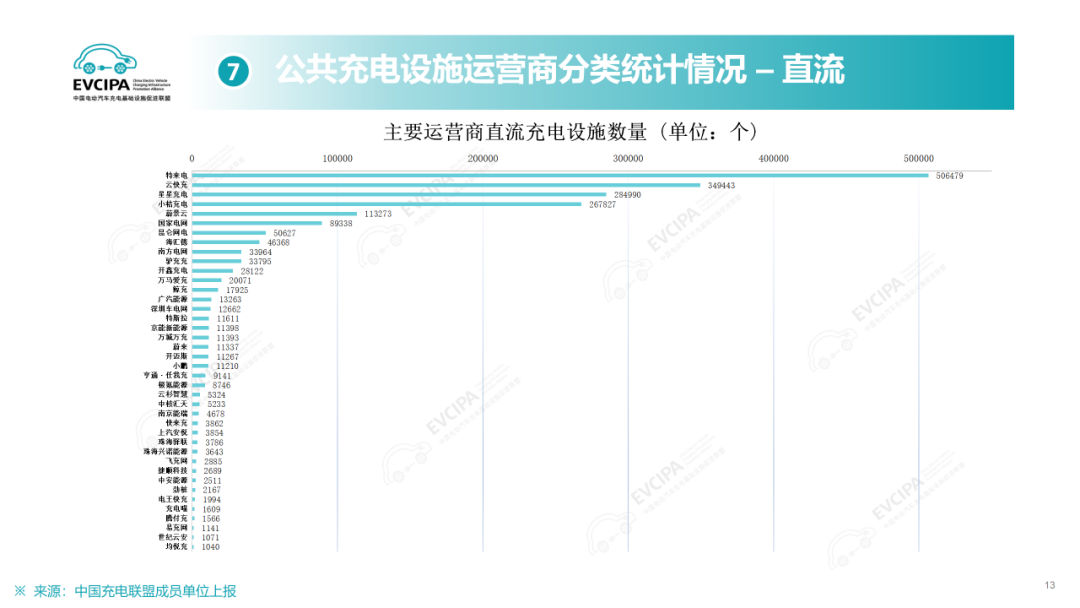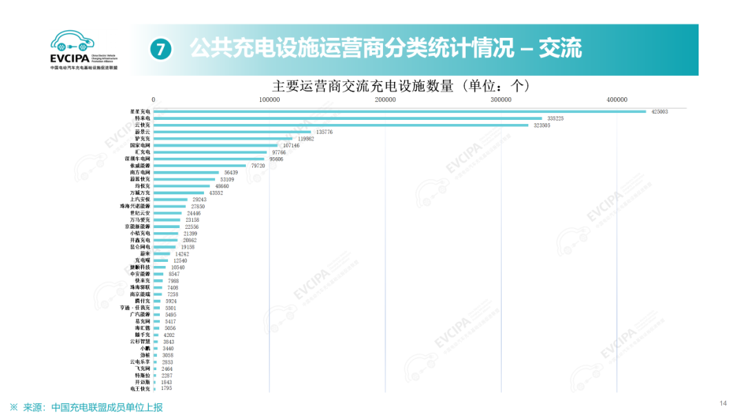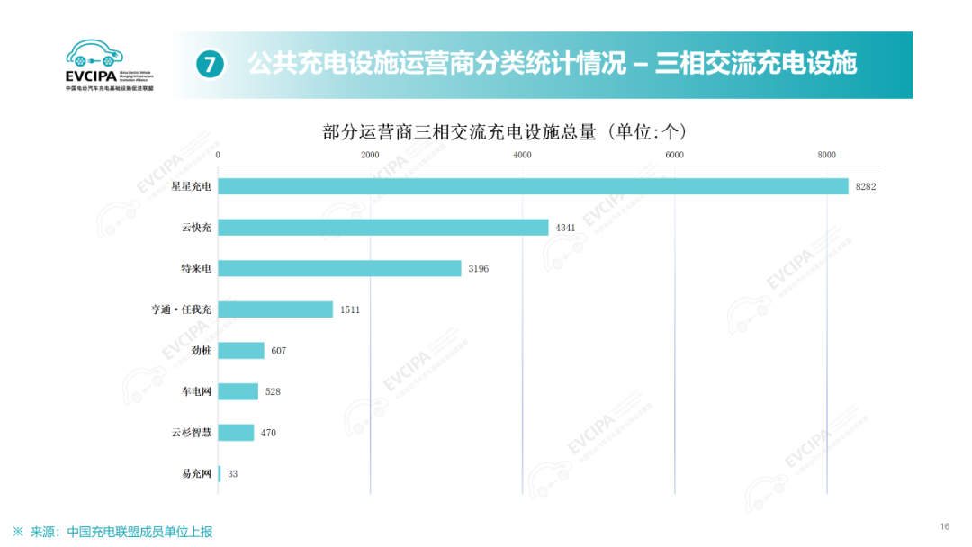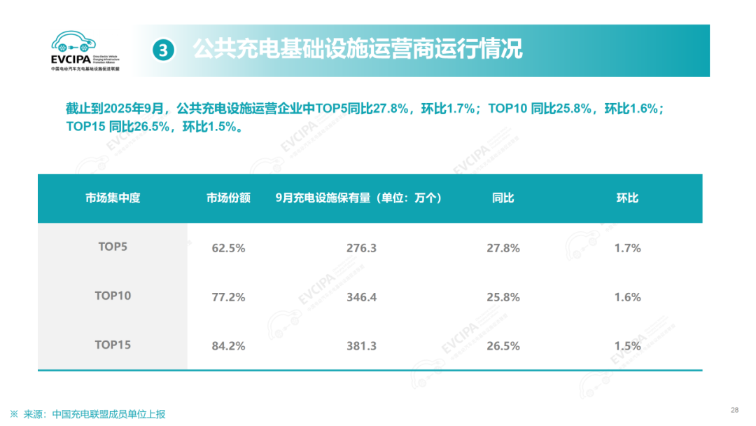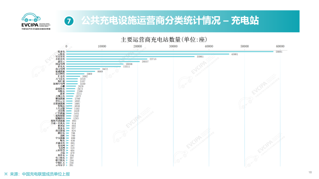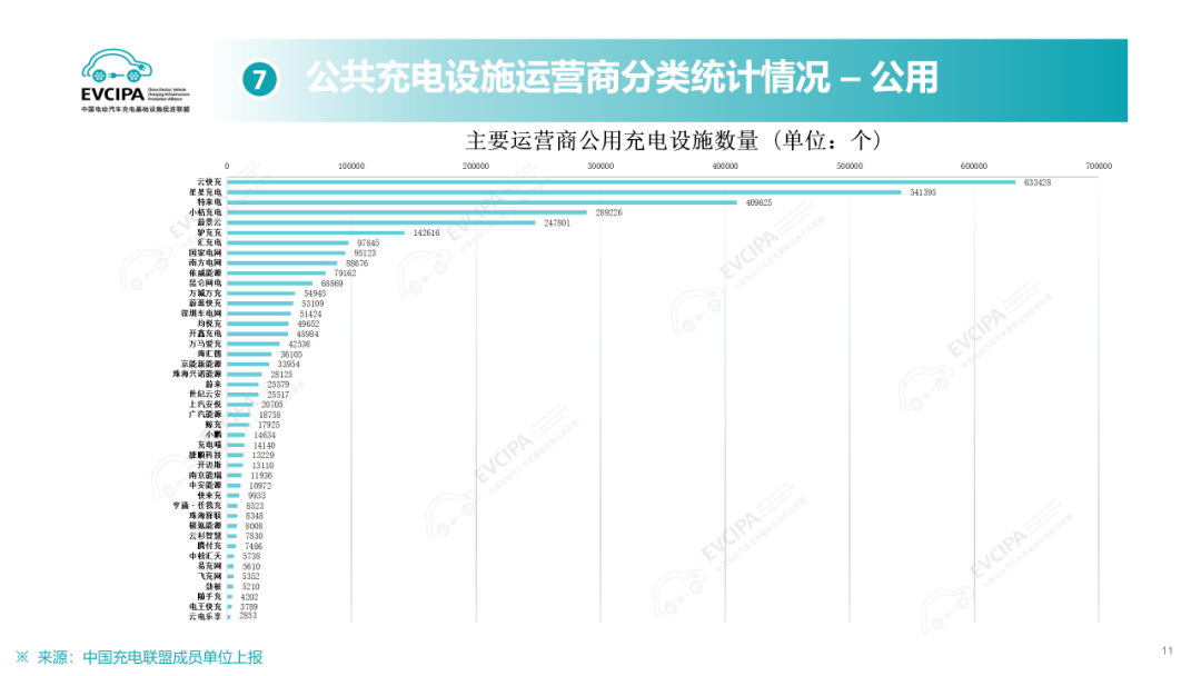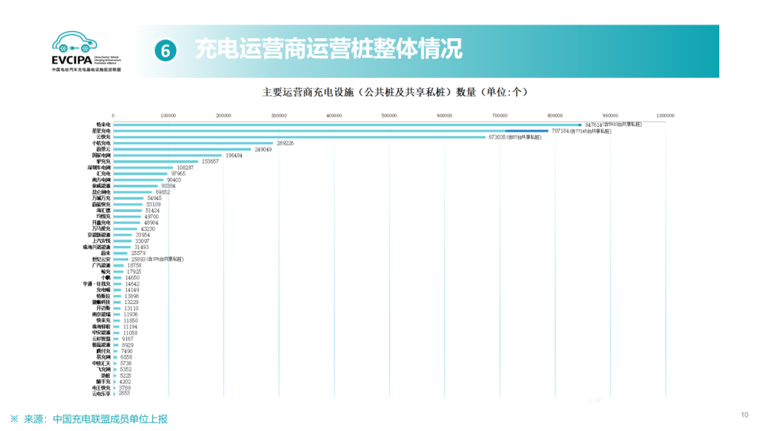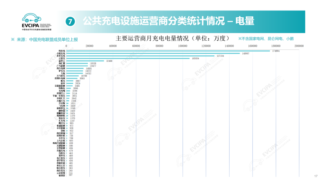 公共充电基础设施运营商运行情况,截止到2025年9月,全国充电运营企业所运营充电桩数量TOP15,分别为:特来电运营84.2万个、星星充电运营71.0万个、云快充运营67.3万个、小桔充电运营28.9万个、蔚景云运营24.9万个、国家电网运营19.6万个、驴充充运营15.4万个、深圳车电网运营10.8万个、汇充电运营9.8万个、南方电网运营9.0万个、依威能源运营8.0万个、昆仑网电运营7.0万个、万城万充运营5.5万个、蔚蓝快充运营5.3万个、海汇德运营5.1万个。这15家运营商占总量的84.2%,其余的运营商占总量的15.8%。