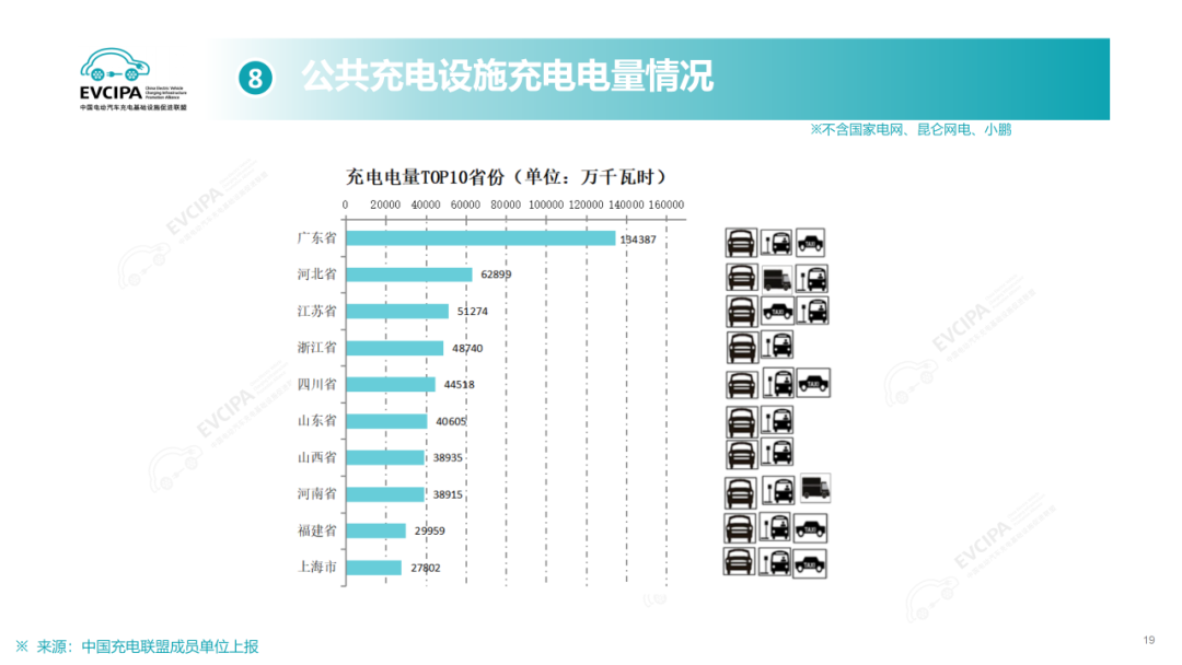 公共充电基础设施省、区、市运行情况,广东、浙江、江苏、山东、上海、河南、四川、安徽、湖北、河北TOP10地区建设的公共充电设施占比达66.6%。全国充电电量主要集中在广东、江苏、河北、四川、浙江、上海、山东、福建、河南、陕西等省份,电量流向以公交车和乘用车为主,环卫物流车、出租车等其他类型车辆占比较小。2025年9月全国充电总电量约76.8亿度,较上月减少4.2亿度,同比增长52.4%,环比下降5.2%。