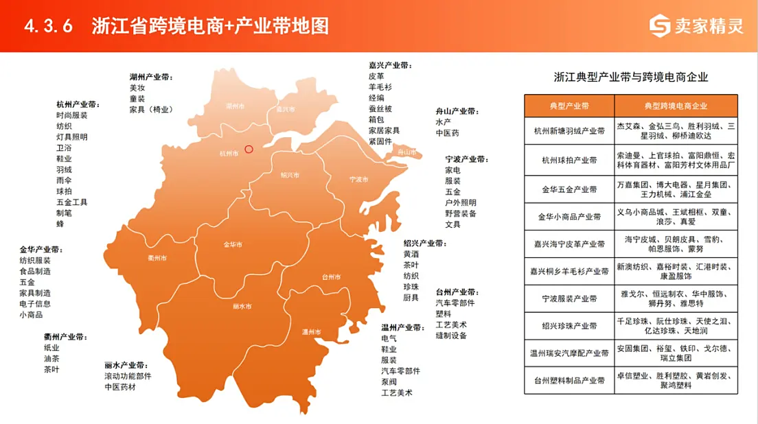 就浙江省来说,就有多条产业带。比如 —— 在杭州、湖州、嘉兴等多个城市都有多条产业带,比较典型的产业带有杭州新塘羽绒产业、杭州球拍产业带等。其中新塘羽绒产业带中做得好的跨境电商企业有杰艾森、金弘三鸟等。