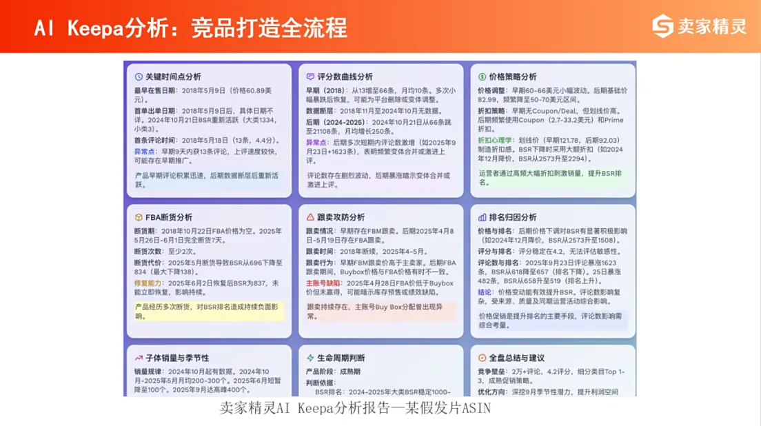 卖家在确定市场后,通过卖家精灵 AI Keepa 分析,能分析竞品的价格、销量、排名趋势,并快速识别出进入“爆发前期”的高潜力产品。让选品决策不再依赖感觉,而是基于数据。
