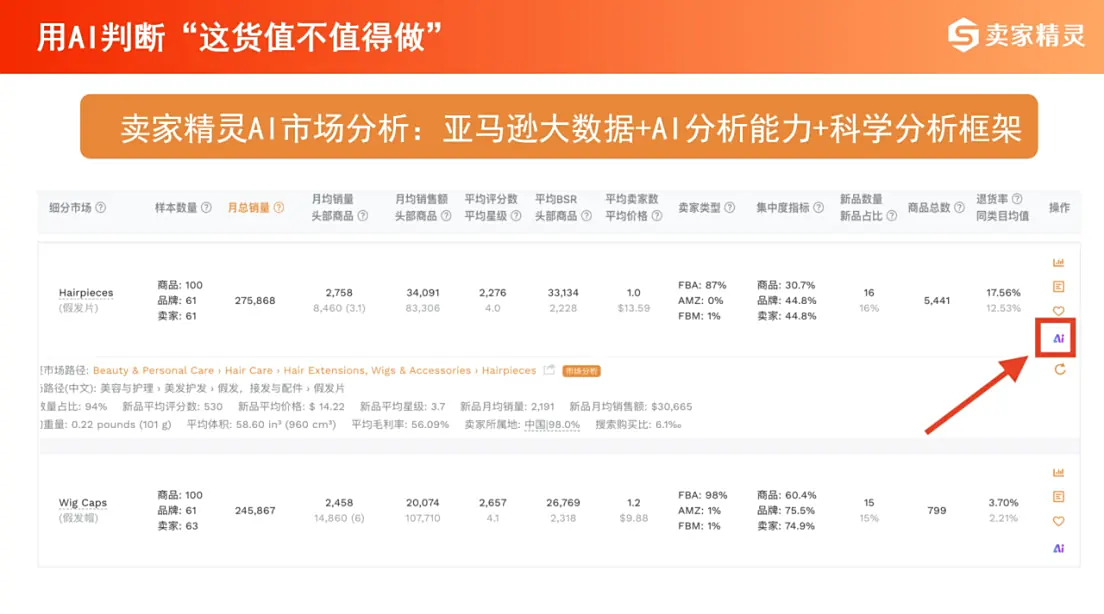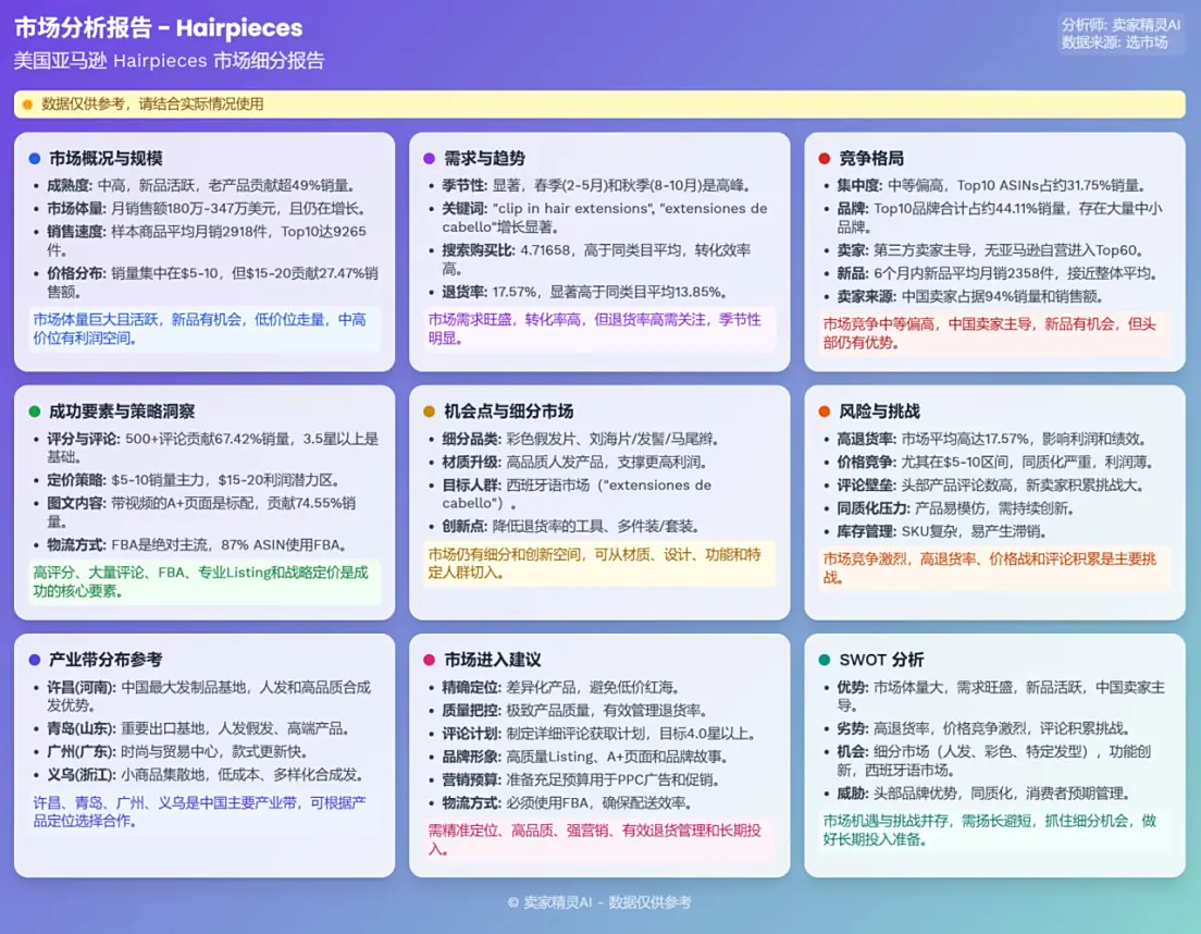 找到细分市场后,再用卖家精灵的 AI 市场分析功能,系统 1 分钟生成市场报告,自动展示规模、趋势、竞争格局、细分机会等 9 大维度数据信息。比如说,下面报告显示假发片这个市场的市场体量大,价格两极分化,季节性还很强,市场还有细分和功能创新空间,可以从真人发、时尚色、特定场景和配件切入等。几分钟,就能判断它是不是你能做的市场。