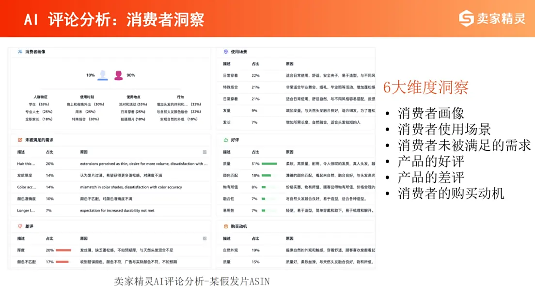 卖家精灵 Wendy 提到,面对成千上万条评论,人工处理不过来,分析维度也不一定科学。现在,利用 AI 信息采集、分类和处理的能力。我们能迅速知道,是谁在哪个场景下使用我们的产品,为什么会使用,他满意不满意的点在哪里?