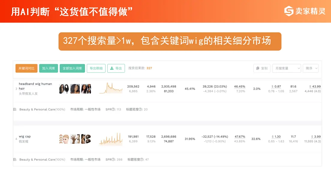 随即,卖家精灵 Wendy 提到很多卖家 & 工厂朋友的困惑:“怎么判断某个产业带的货,在海外市场到底值不值得做?”“哪些产品机会更大,风险又在哪?该怎么切入市场?”现在,AI + 大数据能完美地解决这个问题。以“假发”类目为例,通过卖家精灵关键词选品搜索,会发现搜索量超过 1 万的相关市场就有 300 多个,从“假发帽”“假发片”到“半真半假假发”,每一个关键词背后,都是一个细分市场。