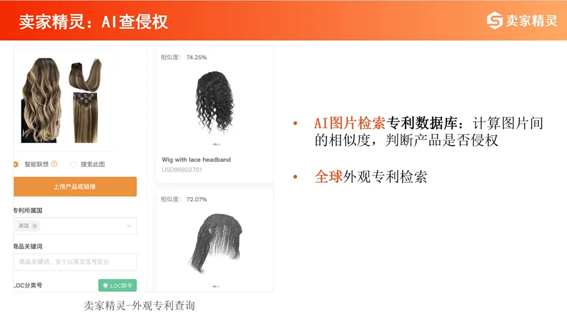 接着,卖家精灵 Wendy 提到跨境卖家比较头疼的事 —— 产品外观专利。针对这块,卖家精灵外观专利查询,通过 AI 能帮助大家快速智能识别潜在风险,降低出海隐患等。