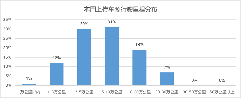 从上传车源行驶里程数据来看,1-3万公里“准新车”数据、5-10万公里的“性价比”车源数据均与上周持平, 3-5万公里的“较新车”数据较上周增加了1%, 10万公里以上“老旧”车源数据较上周则增加了1%,本周上报数据质量较上周略好。