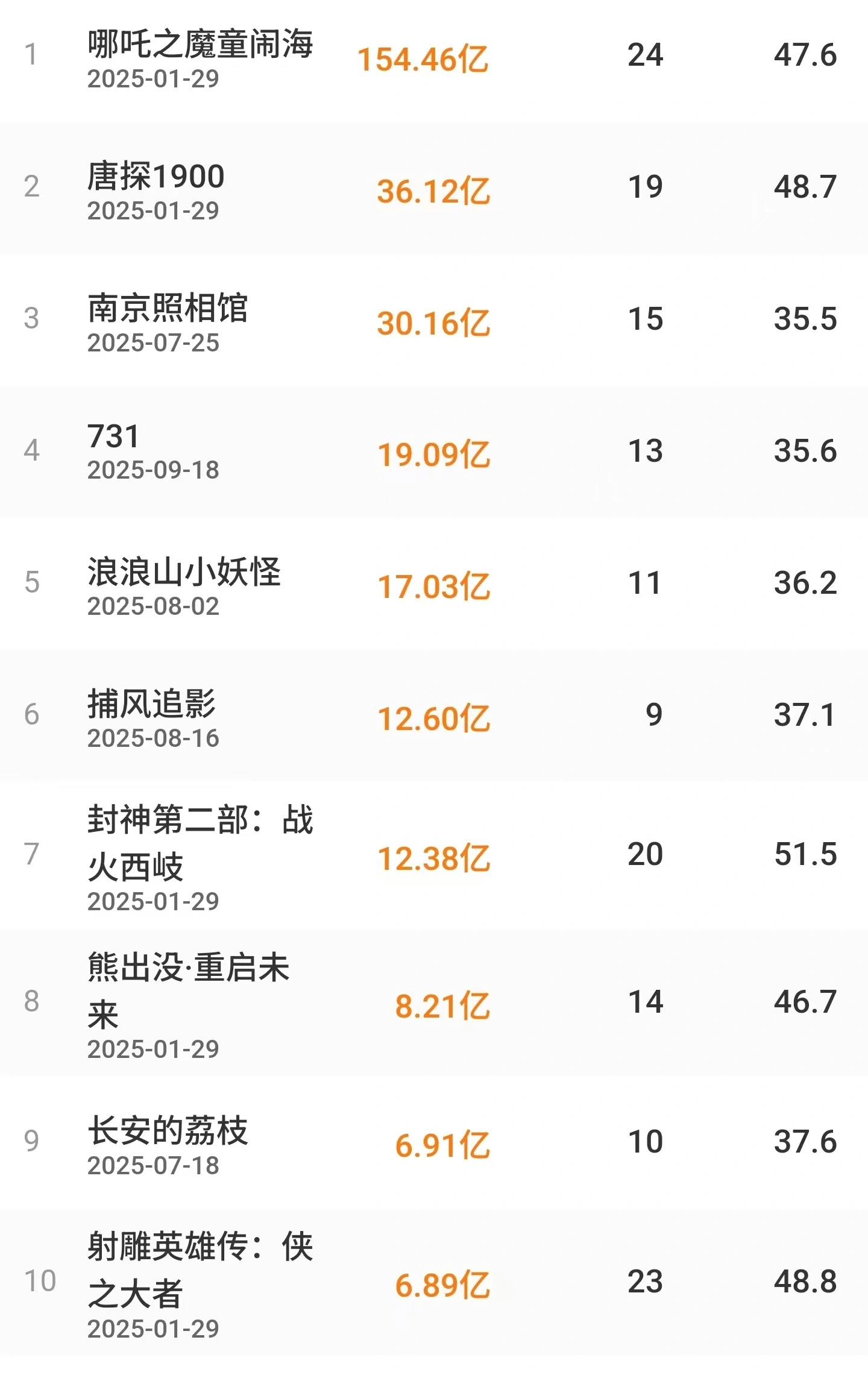 IT之家附 2025 年票房前十(截至 10 月 21 日,数据来自灯塔专业版):