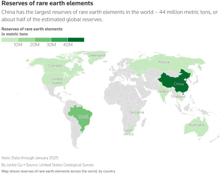 咨询公司艾睿铂估计,中国控制着全球高达70%的稀土开采量、85%的精炼产能,以及约90%的稀土金属合金和磁铁产量。