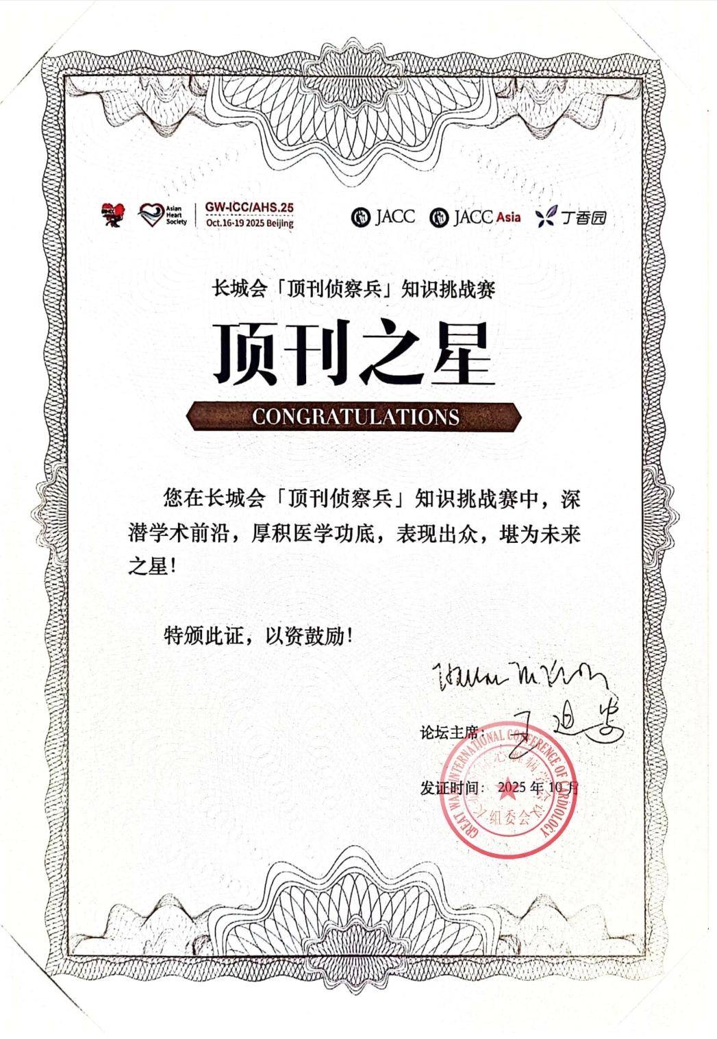 扬子晚报网10月21日讯(通讯员吴唯记者万凌云姜天圣)在刚刚圆满落幕的第36届长城心脏病学大会(GW-ICC2025)暨亚洲心脏大会(AHS2025)上,备受业界关注的“顶刊侦察兵”专场赛圆满收官。10月17日,北京国家会议中心的“长城之星”中央舞台星光熠熠,丹阳市人民医院心血管内科团队与国内顶级医院精英战队同台竞技、巅峰对决。凭借扎实的专业功底、默契的团队协作与出色的临场发挥,最终与顶尖名院浙江大学医学院附属第二医院(浙大二院)并列全国第二名,强势斩获“榜眼”殊荣,为丹阳市人民医院在心血管领域的学术影响力再添浓墨重彩的一笔!