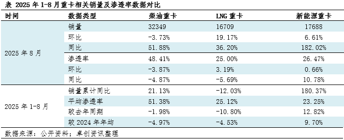 由上表可以看出,1-8月份,重卡销量中柴油重卡、LNG重卡年内平均数渗透率较去年同期均呈现负增长,较2024年全年也呈现跌势,仅新能源重卡平均渗透率较去年同期及较去年全年均保持提升态势。由此可见,柴油重卡的主导地位仍延续一直以来的逐渐瓦解趋势,而同样作为清洁能源且起步较早的LNG重卡,相较于异军突起的新能源重卡领域则存在增速放缓、发展滞后等问题。年内新能源重卡持续保持快速扩张态势,销量及渗透率的不断提升,不仅是数字上的图片,更标志着新能源重卡行业正经历从政策依赖向市场驱动的质变。