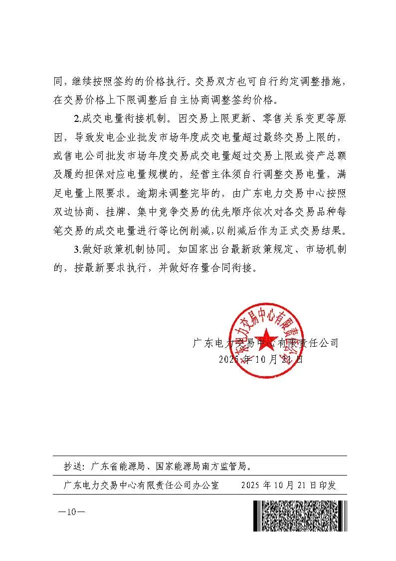 10月21日,广东电力交易中心发布《广东电力市场2026年交易关键机制和参数》。明确年度交易安排,按照《广东电力市场常态化开展年度交易实施方案》相关要求,组织开展2026年年度交易,其中年度交易期间单一售电公司零售用户历史电量占年度交易规模上限的比例不应超过20%。