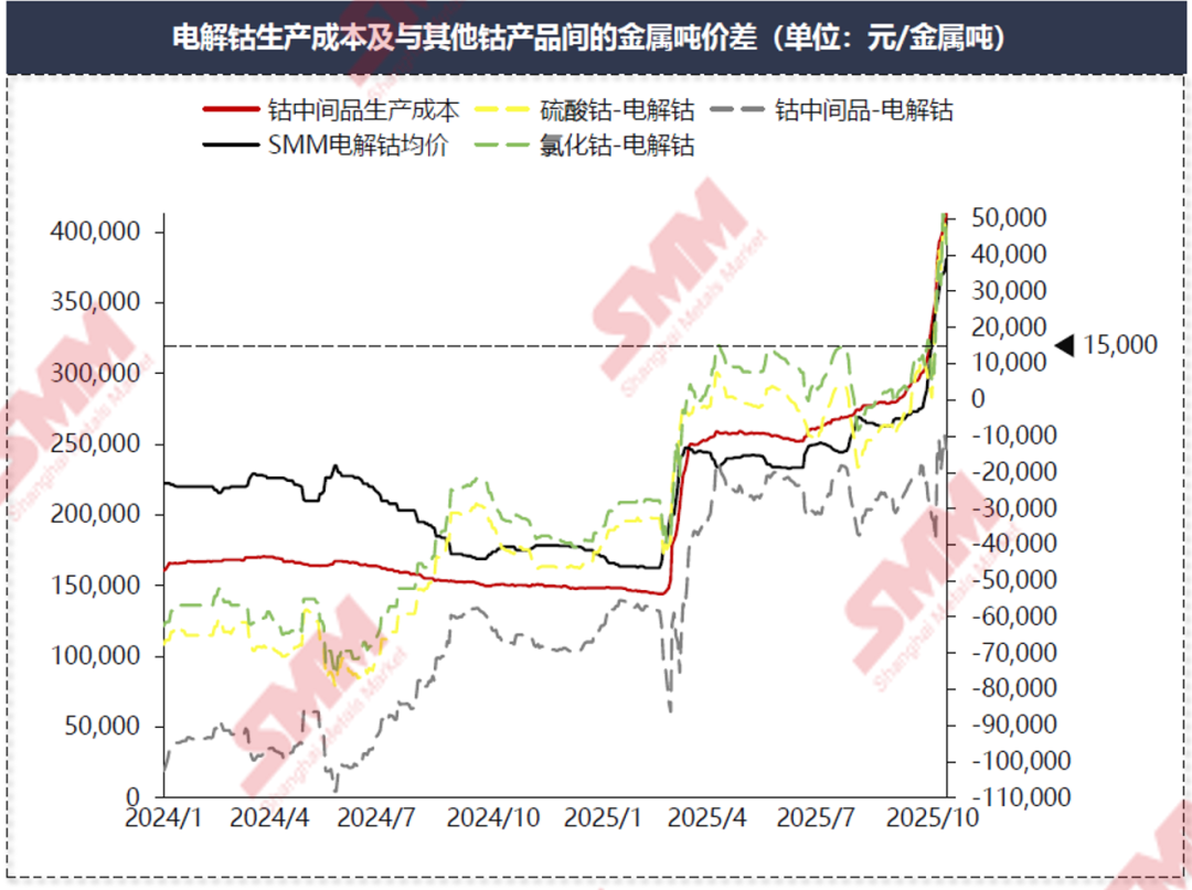 从钴中间品市场来看,自6月起,钴中间品库存快速下降,预计这一趋势将持续;除金属钴外,其他钴产品库存均低于2个月,在成本上升背景下支撑价格传导;若金属钴与其他钴产品价差显著走阔,可能引发回炉重炼,加速其去库进程。