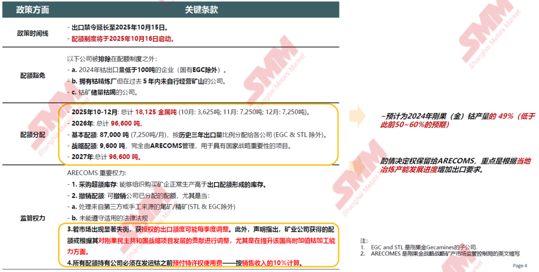 配额均分配给矿山企业及政府控制的平台(EGC、STL、ARECOMS),冶炼厂未获直接配额,配额不得转让、不得延期,当月未经使用配额将重新纳入战略配额。