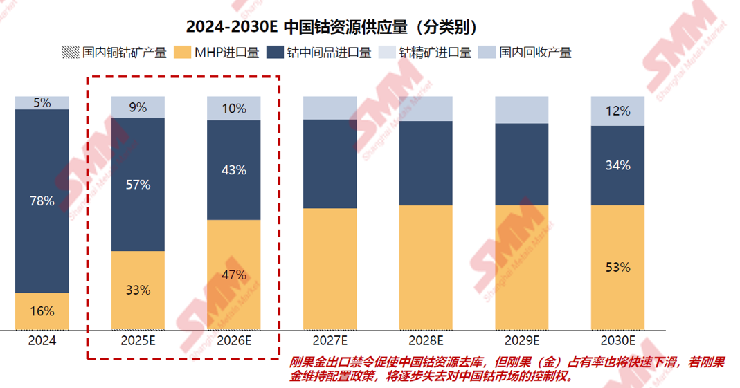在此情景模拟下,SMM预计2025年和2026年中国钴市场或将呈现供应紧缺的情况,直到2027年供应将重新转为过剩。