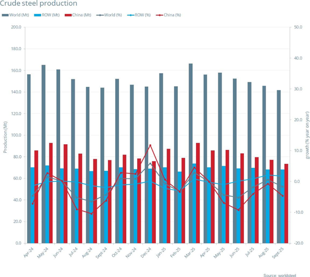 世界钢铁协会数据显示,2025年9月全球70个纳入世界钢铁协会统计国家/地区的粗钢产量为1.418亿吨,同比下降1.6%。