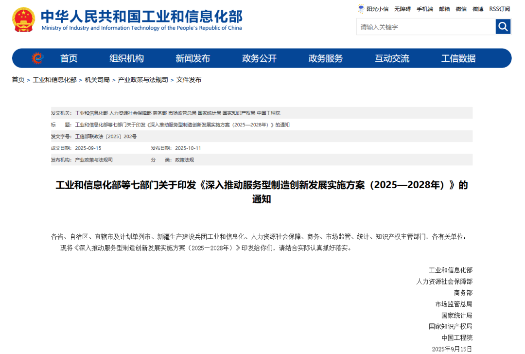 10月11日,一则重磅消息在制造业和金融圈刷屏——工业和信息化部等七部门联合印发了 《深入推动服务型制造创新发展实施方案(2025—2028年)》 。这不仅是国家层面对制造业未来方向的又一次精准定调,更是一张藏宝图,为敏锐的金融从业者,尤其是我们融资租赁公司,清晰地标示出了下一片增长的蓝海。