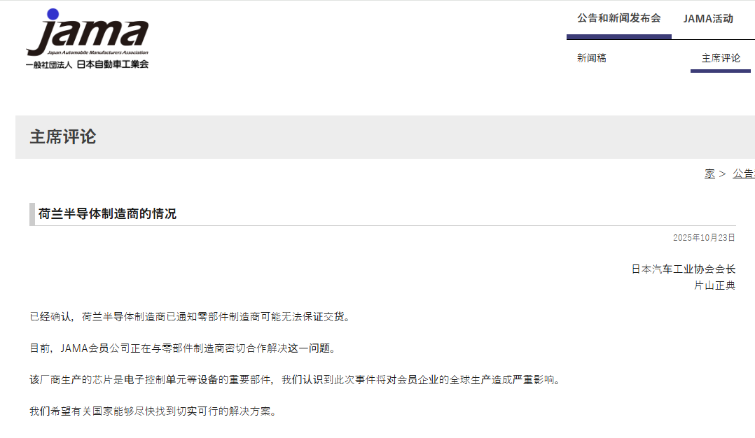 日本汽车工业协会10月23日也发布公告称,经确认,已收到荷兰零部件厂商发来的通知,来自荷兰半导体制造商的产品存在无法保证交付的可能性。目前协会各会员企业正与零部件厂商紧密协作,共同应对此事。该制造商生产的芯片是用于电子控制单元等产品的重要零部件,协会认识到此事将对各会员企业的全球生产造成严重影响。