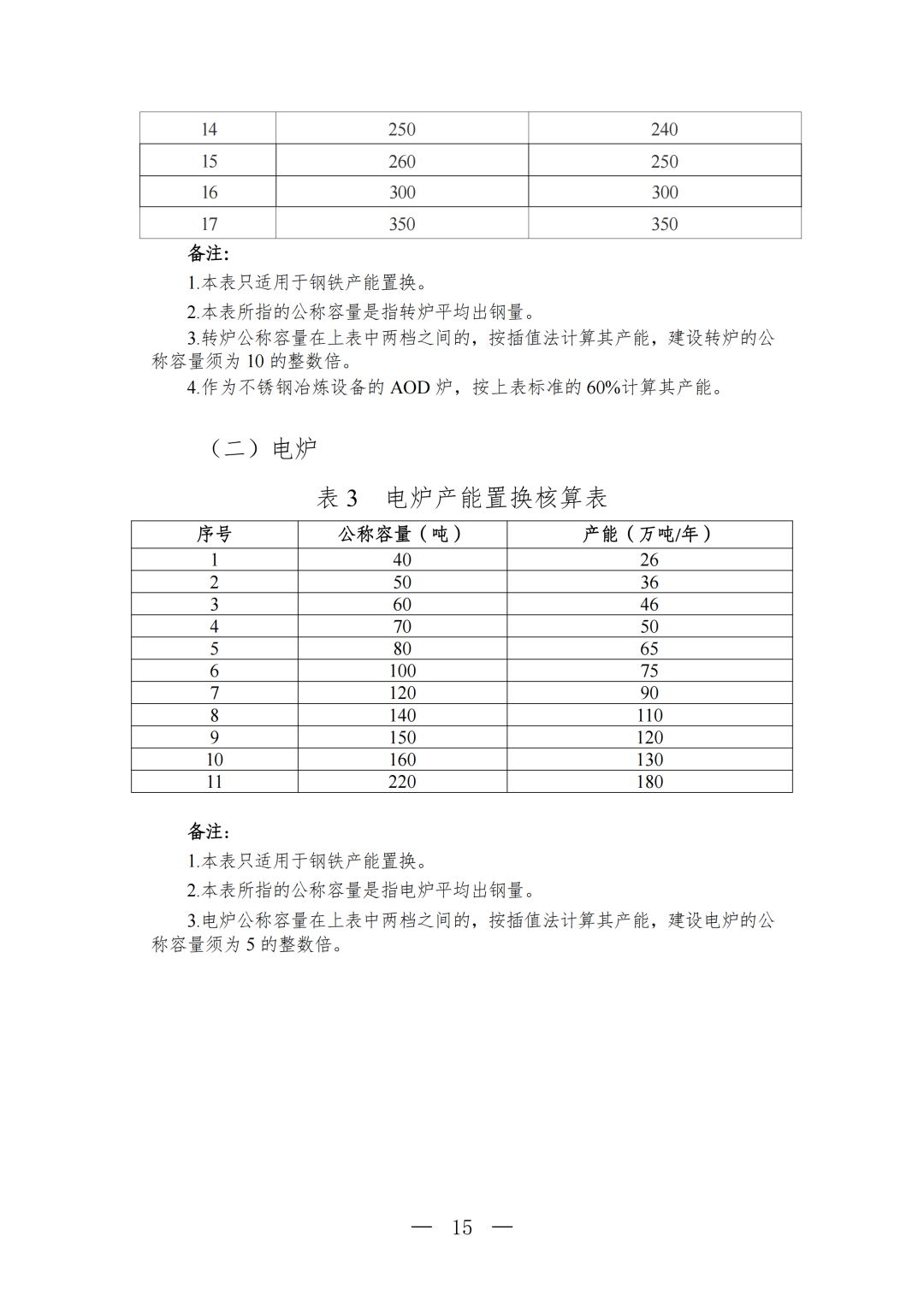 意见稿指出,用于产能置换的冶炼设备须在2016年国务院国资委、各省级人民政府上报国务院备案去产能实施方案的钢铁行业冶炼设备清单内(以下简称国务院清单),以及2016年以来建成的合法合规冶炼设备。以下六类产能不得用于置换:(一)列入钢铁去产能任务的产能、享受奖补资金支持的退出产能;(二)在省级工业和信息化主管部门公告产能置换方案前冶炼设备未实际建成投产的产能;(三)《产业结构调整指导目录》规定的淘汰类落后生产设备产能;(四)自本办法实施之后,企业全部炼铁、炼钢设备连续2年每年运转天数不足90天的产能;(五)铸造、锻压、铁合金等非钢铁行业冶炼设备产能;(六)提钒转炉、二次精炼炉、感应炉等辅助生产设备产能,未履行产能置换手续或未列入国务院清单的脱磷转炉、氩氧脱碳炉(AOD)产能。