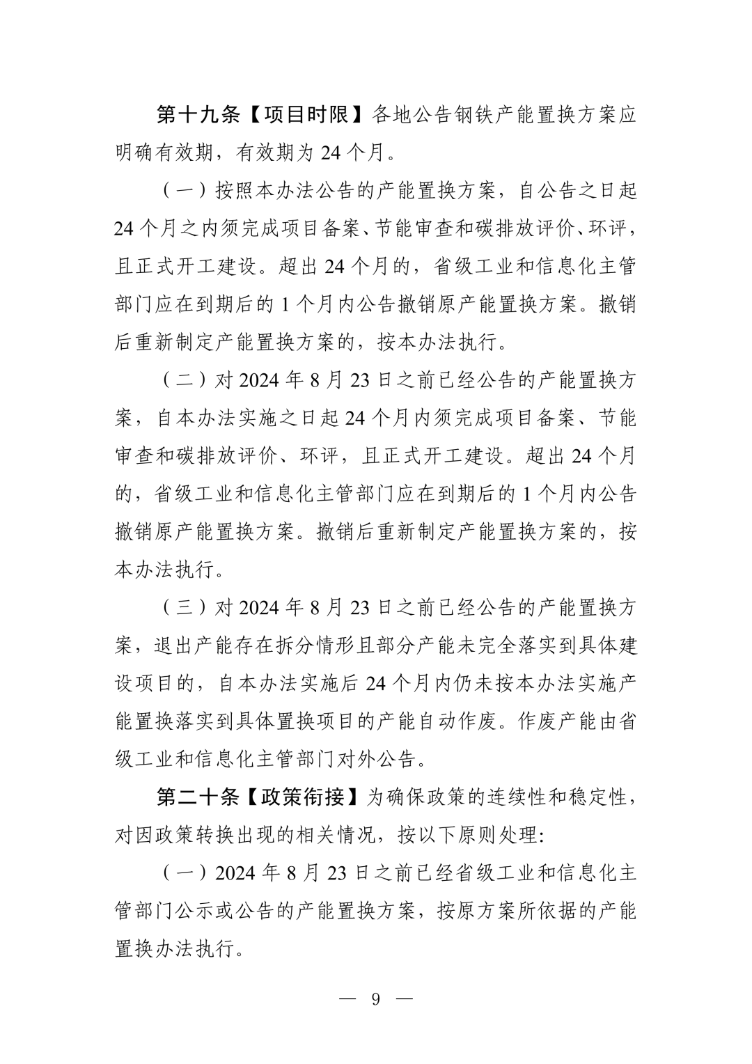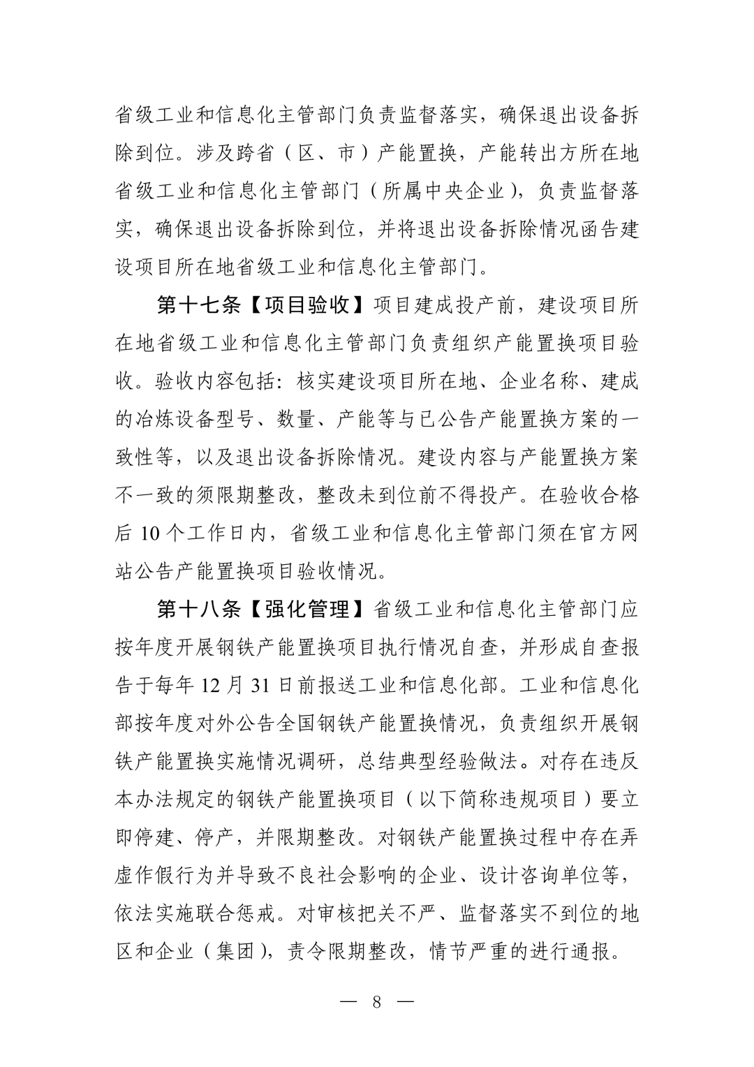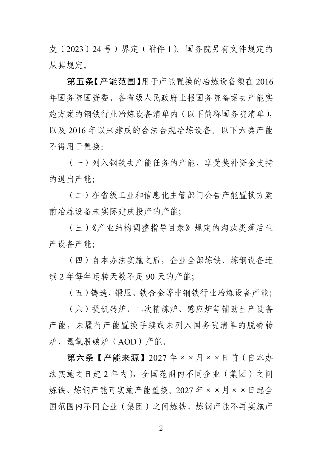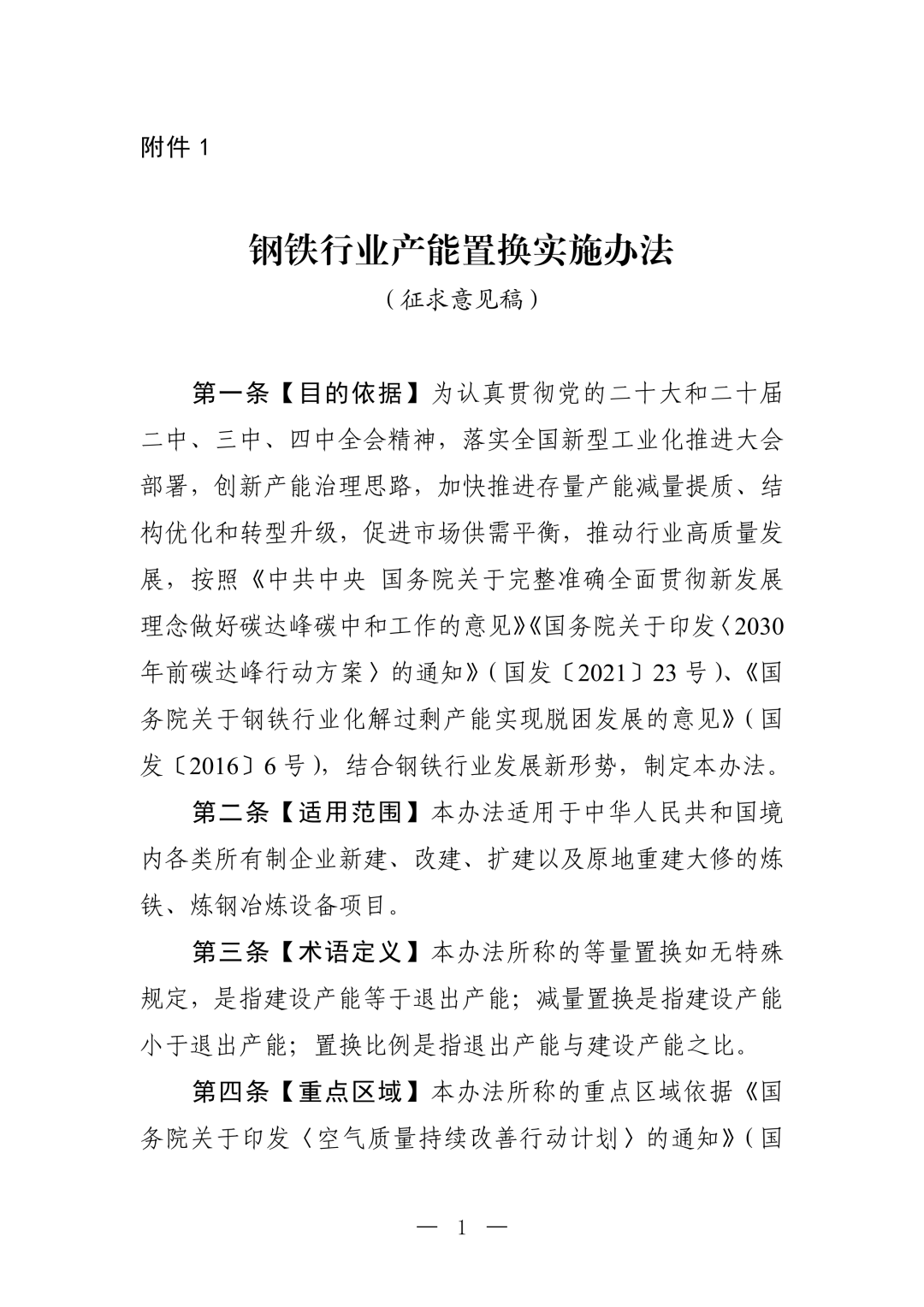 为落实全国新型工业化推进大会部署,加快推进存量产能减量提质、结构优化和转型升级,促进市场供需平衡,推动行业高质量发展,依据国家有关法律法规和产业政策,工业和信息化部对《钢铁行业产能置换实施办法》(工信部原〔2021〕46号)进行了修订,研究形成了《钢铁行业产能置换实施办法(征求意见稿)》(见附件1),现公开征求意见。如有意见或建议,请于11月23日前书面反馈工业和信息化部原材料工业司(钢铁处)。
