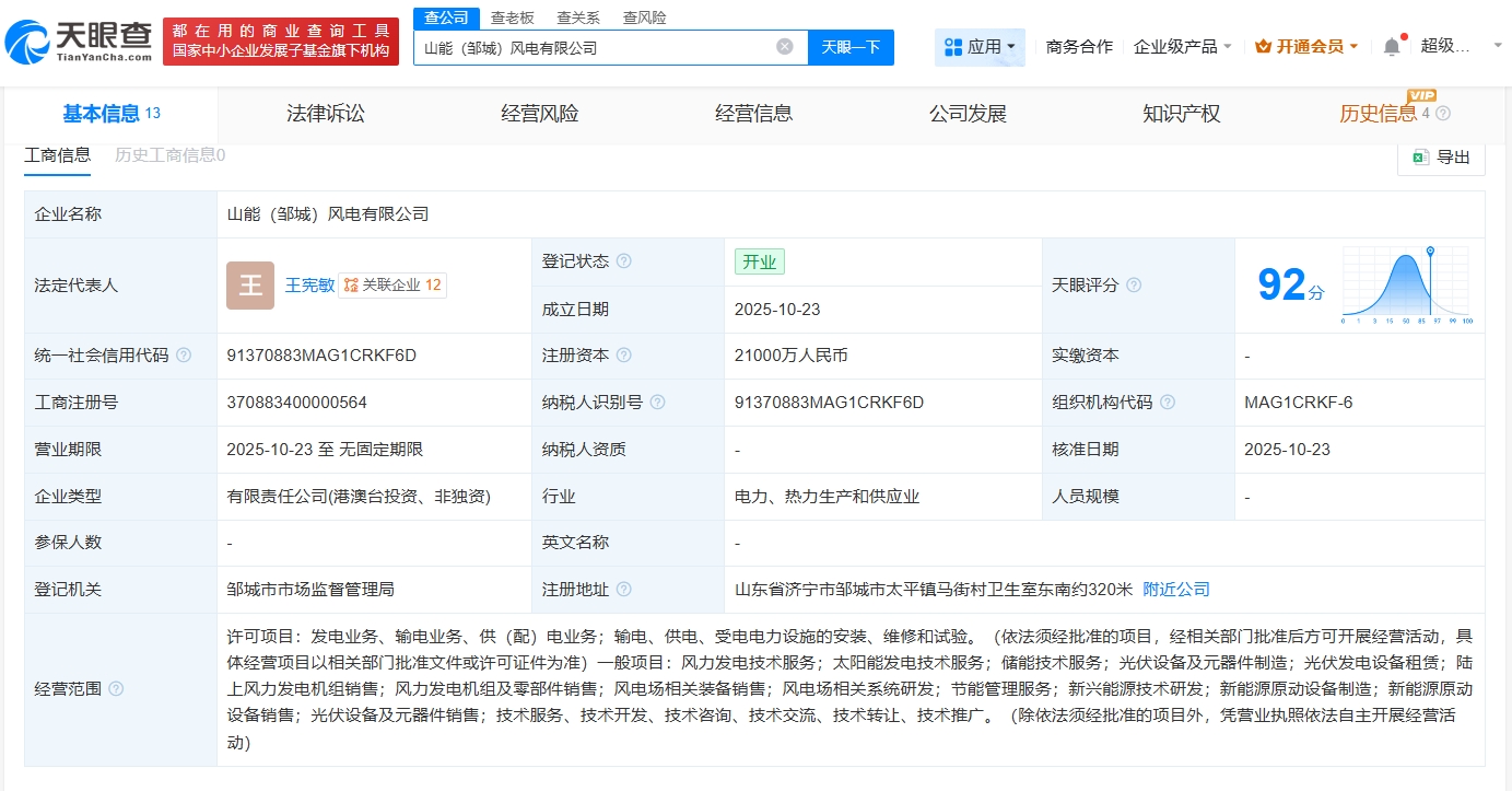 每经AI快讯,天眼查App显示,近日,山能(邹城)风电有限公司成立,法定代表人为王宪敏,注册资本2.1亿元,经营范围包括风力发电技术服务、太阳能发电技术服务、储能技术服务、光伏设备及元器件制造等。股东信息显示,该公司由山东能源集团新能源集团有限公司、兖矿能源(600188)、兖煤国际(控股)有限公司共同持股。