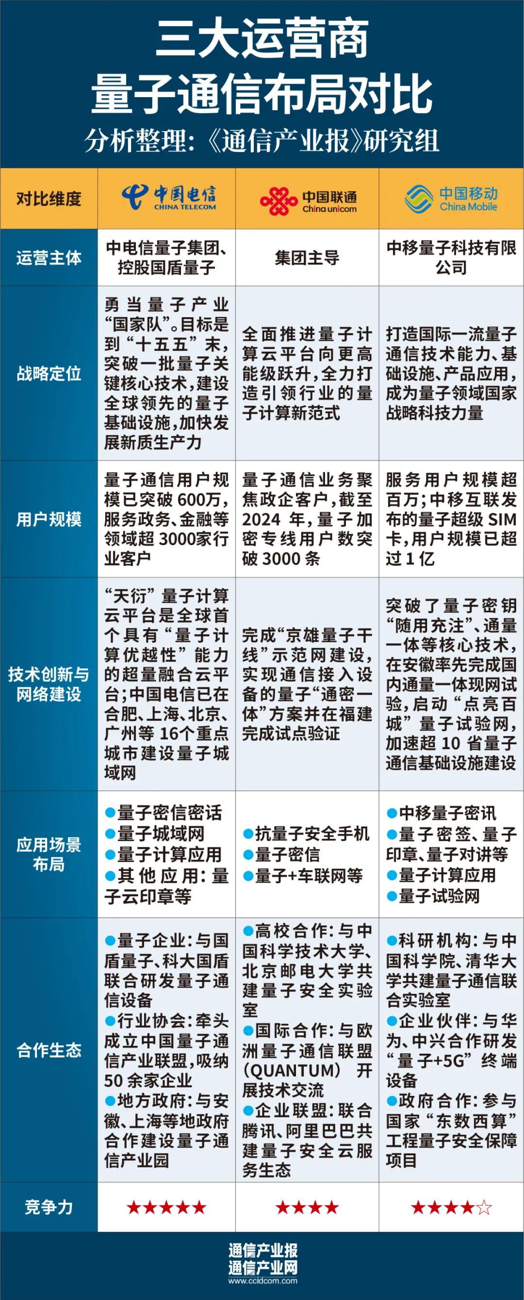 近日,随着中国移动(600941)系统展示量子通信总体布局,三大运营商的量子通信发展备受关注。
