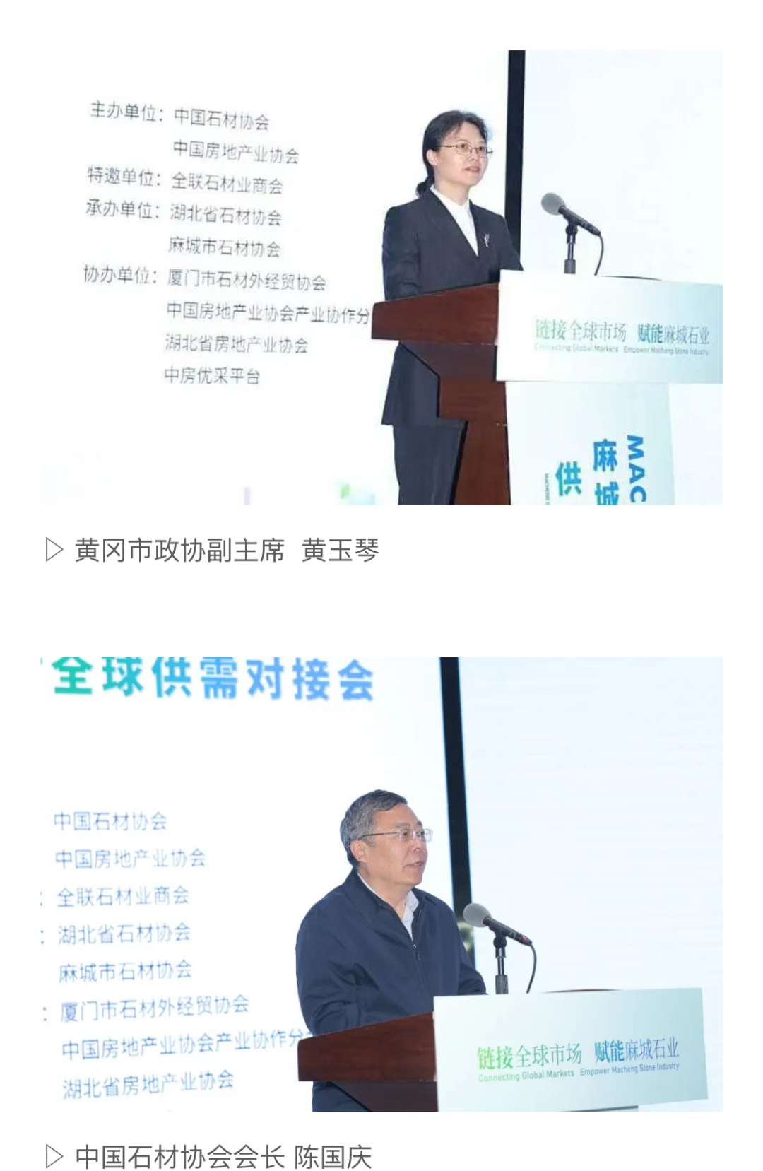 住房城乡建设部帮扶办公室主任、一级巡视员董红梅,黄冈市政协副主席黄玉琴,中国石材协会会长陈国庆,全联石材业商会会长刘良等领导嘉宾先后发言,充分肯定麻城石材产业的发展成果与潜力,并表示将持续支持麻城打造石材产业新高地。