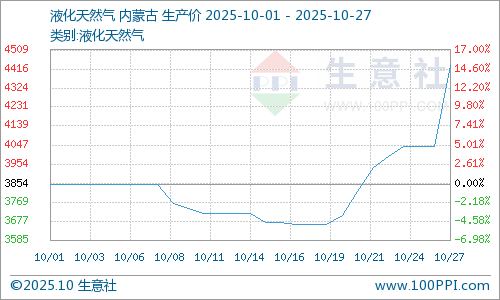 据生意社商品行情分析系统,2025年10月1日至10月27日,内蒙古液化天然气(LNG)出厂价呈现“先抑后扬”的剧烈波动,半个月内累计涨幅超20%,创下年内单月最大涨幅。从10月1日的3854元/吨起步,经历短暂回调后(10月17日最低跌至3662元/吨,跌幅4.9%),自10月19日起开启快速拉升模式,至10月27日已突破4432元/吨,较阶段低点反弹超20%,市场呈现“V型”反转态势。