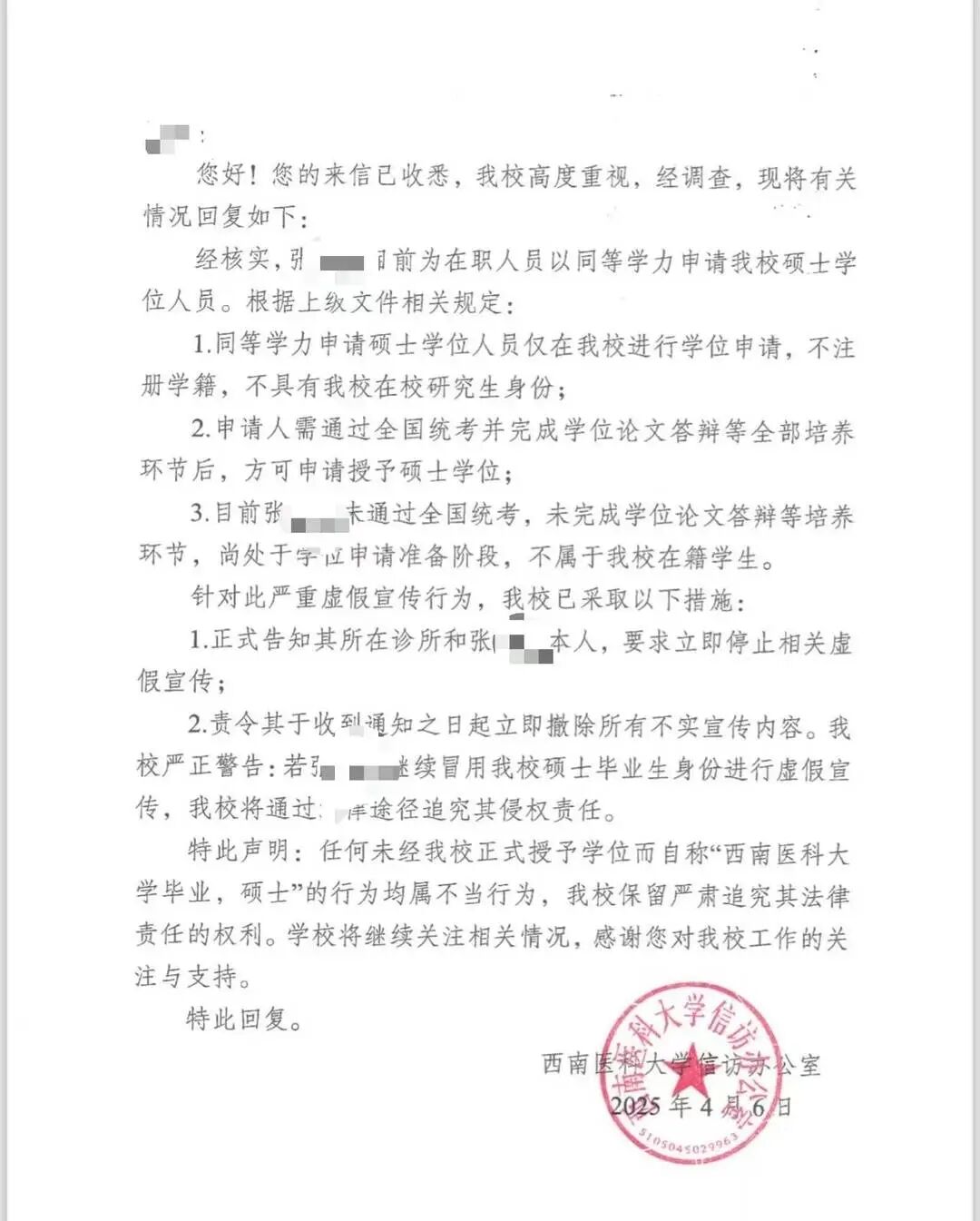 康女士称,她向校方求证后,被告知张某并未取得该校硕士学位。她提供的校方信访办公室回信显示:校方称,经核实,张某为在职人员以同等学力申请该校硕士学位人员,目前其未通过全国统考、未完成学位论文答辩等培养环节,尚处于学位申请准备阶段,不属于该校在籍学生。针对此次严重虚假宣传行为,校方已正式告知其所在诊所和张某本人,要求立刻停止相关虚假宣传;责令其立即撤除不实宣传内容。
