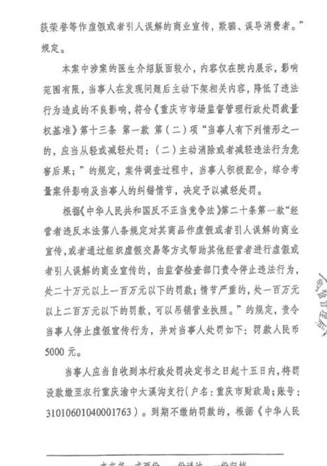 决定书称,渝中区市监局认为,本案中涉案医生的介绍版面较小,内容仅在院内展示,影响范围有限,当事人在发现问题后主动下架相关内容,降低了违法行为造成的不良影响……当事人积极配合,综合考量案件影响及当事人的纠错情节,决定予以减轻处罚。根据反不正当竞争法相关规定,责令当事人停止虚假宣传行为,并处以5000元罚款。