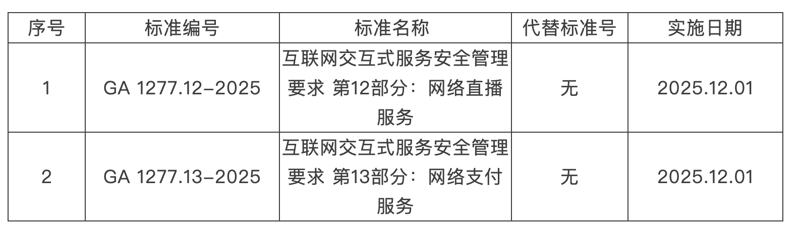 人民财讯10月29日电,近日,公安部发布的2025年第1号《中华人民共和国公安部公共安全行业标准公告》,由公安部信息系统安全标准化技术委员会归口的8项公共安全行业标准正式发布。其中强制标准包括《互联网交互式服务安全管理要求第12部分:网络直播服务》《互联网交互式服务安全管理要求第13部分:网络支付服务》,以上强制性标准将于2025年12月1日起正式实施。其他6项推荐性标准将于2026年2月1日起正式实施。