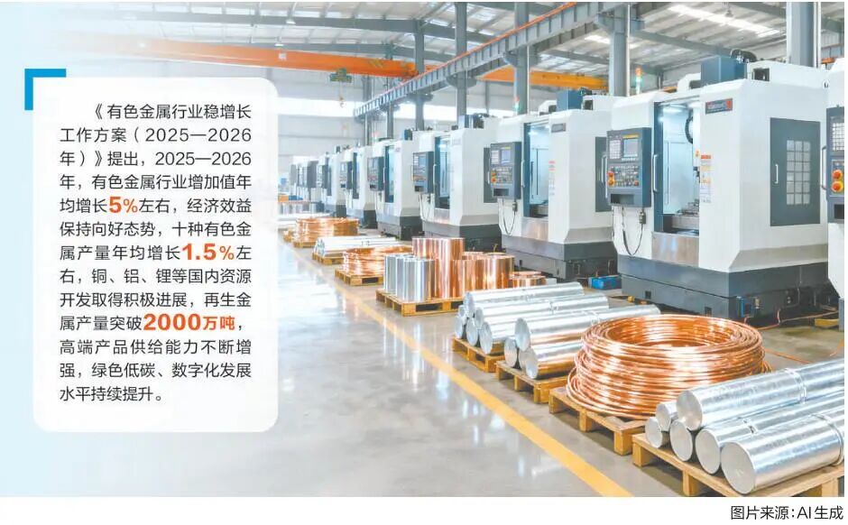 《方案》提出,2025—2026年,有色金属行业增加值年均增长5%左右,经济效益保持向好态势,十种有色金属产量年均增长1.5%左右,铜、铝、锂等国内资源开发取得积极进展,再生金属产量突破2000万吨,高端产品供给能力不断增强,绿色低碳、数字化发展水平持续提升。