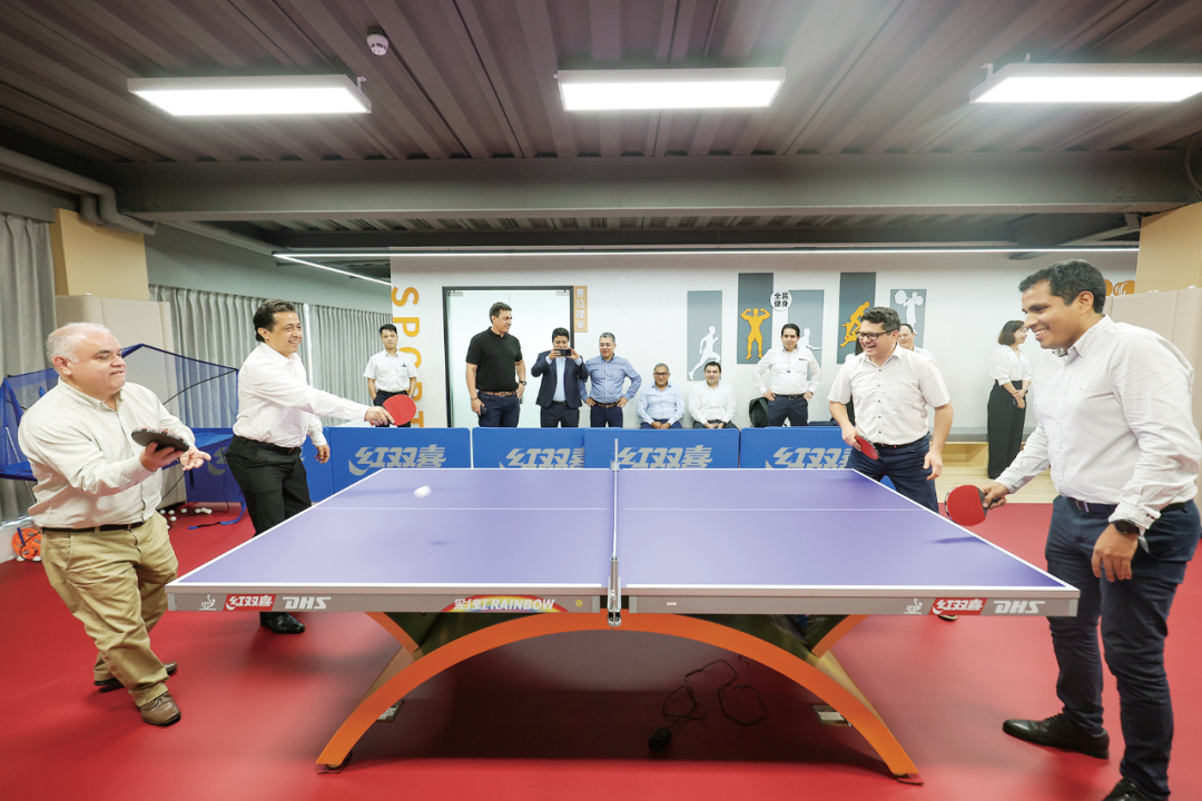 ▲图为南网国际秘鲁博路兹公司秘鲁籍员工体验乒乓球运动。