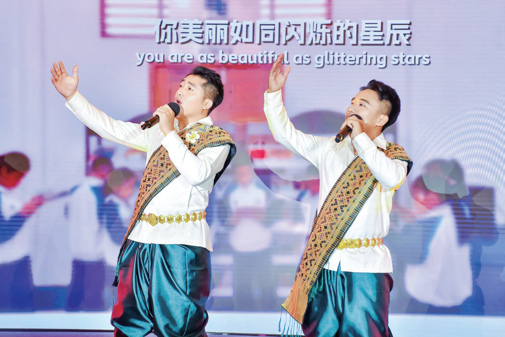 ▲图为文化汇演时,南网国际老挝南塔河公司老挝籍员工演唱老挝歌曲《占芭花》。