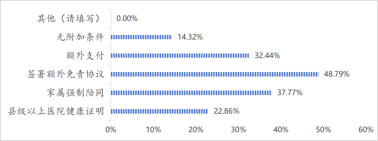 问卷数据显示,在因年龄问题被拒接或限制参团的受访者中,70岁以上占比43.3%,75岁以上占比30.1%,65岁以上占比19.7%,60岁以上占比5.0%。除年龄门槛外,48.79%的老年游客被要求签署额外免责协议,37.77%需强制家属陪同,22.86%需提供县级以上医院健康证明。
