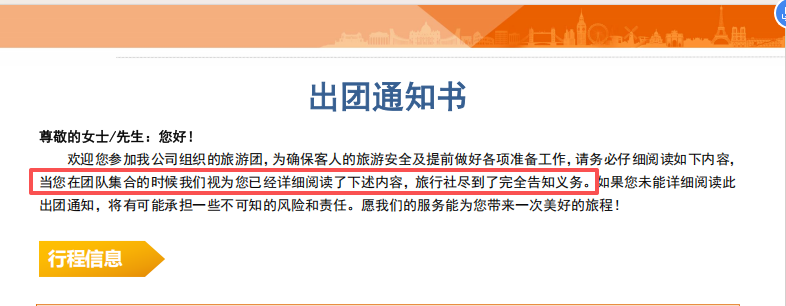 旅行社出团通知书的告知内容。江苏省消保委供图