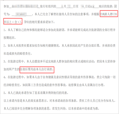 一家旅行社的参团提醒中列明“70-74岁游客参团需有60岁以下年轻家属朋友陪同,并签署免责协议书。此行程不接受年龄超过74岁游客参团”。江苏省消保委供图