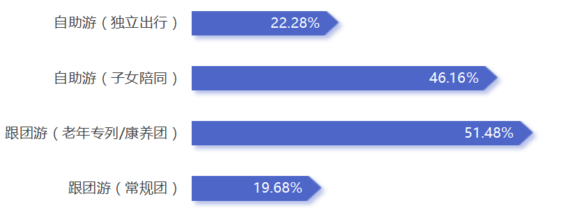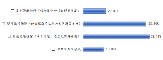 旅游偏好与服务需求方面,51.48%选择老年专列/康养团类型的跟团游,46.16%选择子女陪同的自助游,选择独立出行的自助游,占比22.28%。愿付费的附加服务需求中,受访者对舒适的交通住宿需求最高,占62.12%;其次是随行医疗保障,占58.3%,反映出对舒适度、安全性、适老化的核心需求。