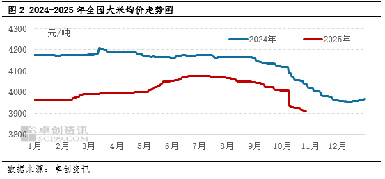 10月全国大米价格延续下跌走势。各产区米厂已经转向新季稻谷的加工,由于正处于新季稻谷集中上市期,市场供应量阶段性增加,米厂采购成本下行,全国大米价格跟跌。截至10月29日,全国大米均价为3910元/吨,同比下跌2.90%,环比下跌2.47%。
