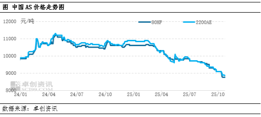 10月以来AS市场价格跌幅加深。成本拖累、供需结构转弱以及商品流通性不强,导致月内业者预期走弱,AS市场价格持续疲态,并且未出现短期修复行情,各方博弈信心受抑,整体市场积弱难返。因供需矛盾依旧存在,11-12月AS市场或继续承压。